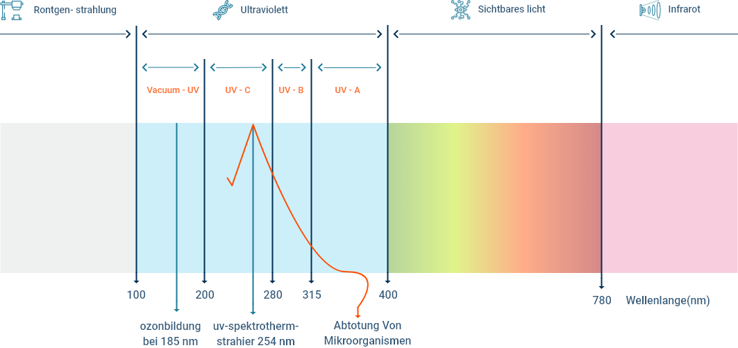 Die UV-Sterilisationslampe zerstört die Molekulare Struktur der DNA (Desoxyribonukleinsäure) oder RNA (Ribonukleinsäure) (Säure) in bakteriellen Viren durch ultraviolette Strahlen mit einer Wellenlänge im Bereich von 240 bis 280 nm, was zum Absterben des Zellenwachstums führt als auch dem regenerativer Zelltod, hierdurch wird eine Sterilisation erreicht.Dieses Produkt verwendet zwei Arten von Lampen mit Wellenlängen von 270-280 nm sowie 400 nm, welchen den Sterilisationseffekt gegenüber herkömmlichen UV-Lampen deutlich